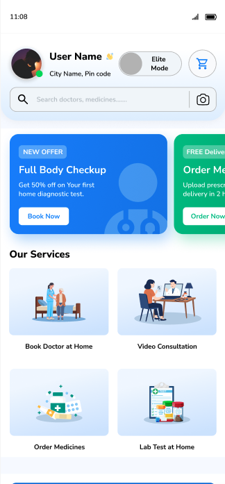Choose from Home Doctor Visits, Live Consultations, Lab Tests, or Order Essential Medicines.